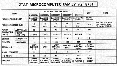 図2は私が武蔵工場長時代に使用した、顧客向けの説明資料(Products and Technologies 1986)の中の1枚であるが、日立のZTAT製品とインテルの対抗製品(8751)とが比較されている。日立品はCMOS、インテル品はNMOSである。インテル品に比べてスピードは同等以上であり、消費電力は動作時で15分の1、スタンバイ時で10分の1程度である。パッケージは日立品がプラスチック(ZTAT)であるのに対し、インテル品はCERDIP(セラミック)である。この比較表から、両者の格段の違いを読み取ることが出来る。