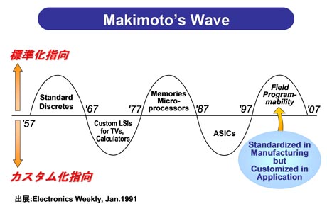 このウエーブにおいて予測されたことは、87年から97年の10年間は「ASICが主導するカスタム化の時代」であるが、97年から07年に到るサイクルは「フィールド・プログラマビリティーが主導する標準化の時代」としたのである。