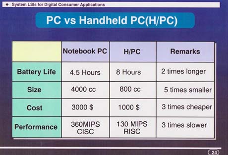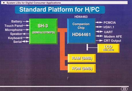 この発表に続いて11月のCOMDEXにおいては7社からHPCの製品発表が行われた。SHマイコンを採用したのはHP、コンパック、カシオ、日立、LG電子の5社。対するMIPS採用はNECとフィリップスの2社。一騎打ちの勝負は5対2でSHの圧勝となったのである。