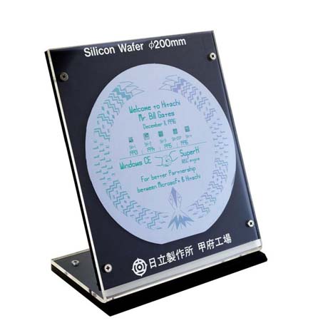 レドモンドにおける、上記の会議に続いて同年12月11日にはビル・ゲイツ氏が日立本社を訪問した。図8はそのときに同氏に送ったプレゼントである。当時の最先端であった200mmΦのウエーハに電子ビームによって次のように記されている: