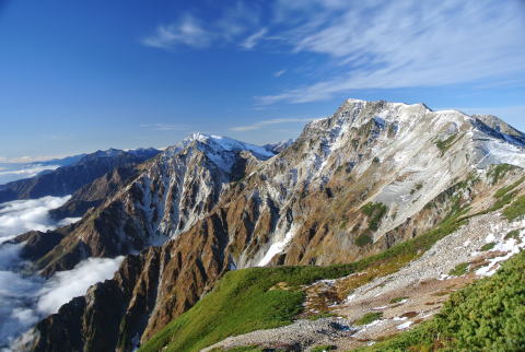 先月に続けて、今月も涼しげな山岳風景を掲載します。栂池の広葉樹林帯を抜けると、這松と岩稜の尾根が続き、白馬岳山頂へと繋がります。