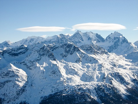 今月のテーマは「雪山」、アルプスの冬景色です。撮影場所はサンモリッツスキー場(スイス)、ここでは年間の約9割の日が<晴れ>です。