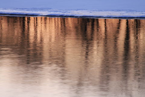 今月のテーマは「凍てつく樹々」、会津の、寒々とした中にも凛とした樹々が、湖面に映る夕景です。