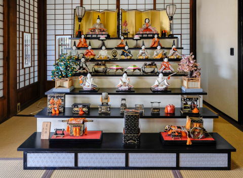 今月のテーマは「ひな祭り」、古民家の古式ゆかしい雛飾りから、桃の香りとともに春の訪れが感じられます。