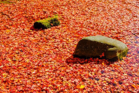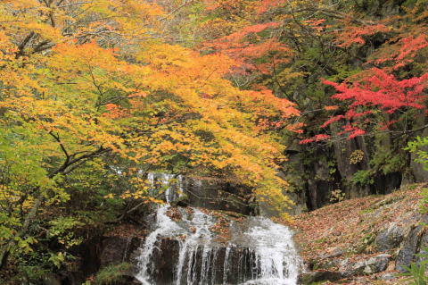晩秋。秋深く鮮やかな木々の彩りの中で、流れ落ちる水の音が聞こえてくるようです。