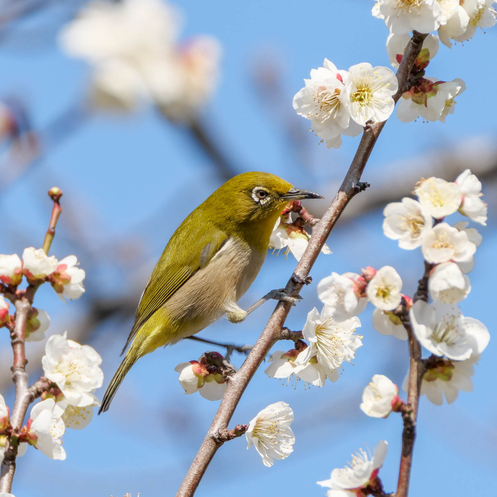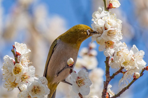 今月のテーマは「梅とメジロ」。満開の梅に生き生きとしたメジロ、いいコンビです。