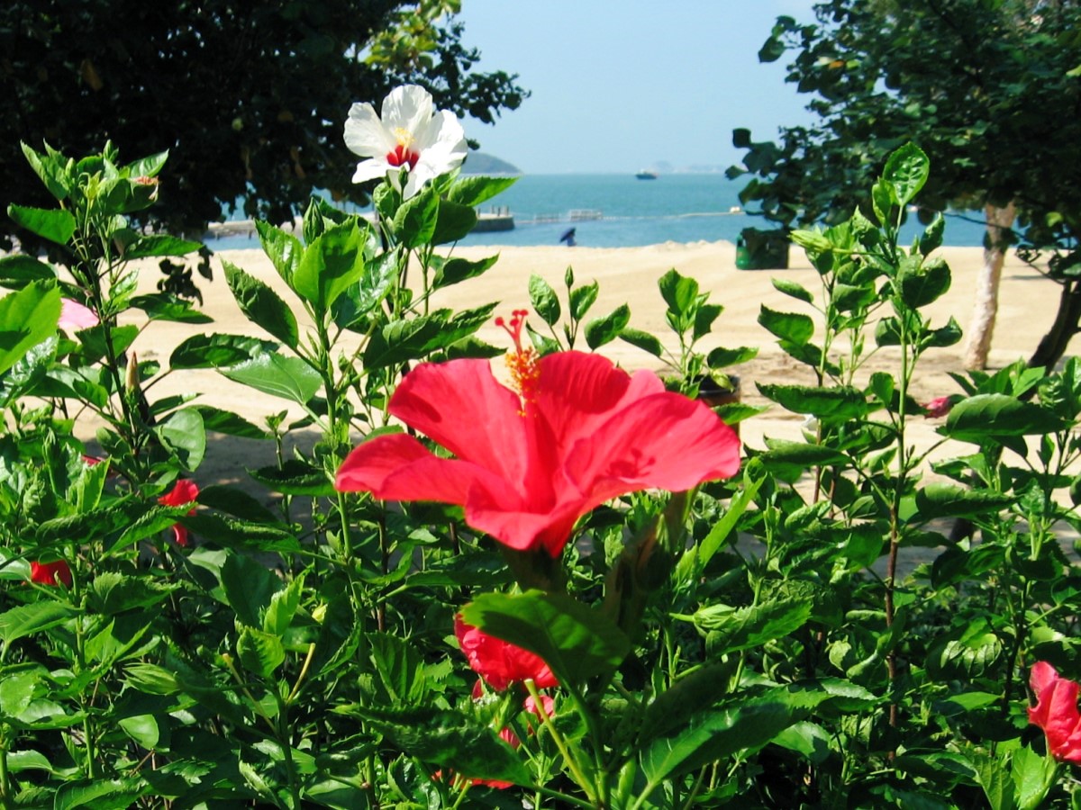 厳しい残暑が続いて、秋の訪れが遅れているようです。今月の花は浜辺に咲く真っ赤なハイビスカス、遠くに見える海を背景にして、鮮やかに咲いています。
