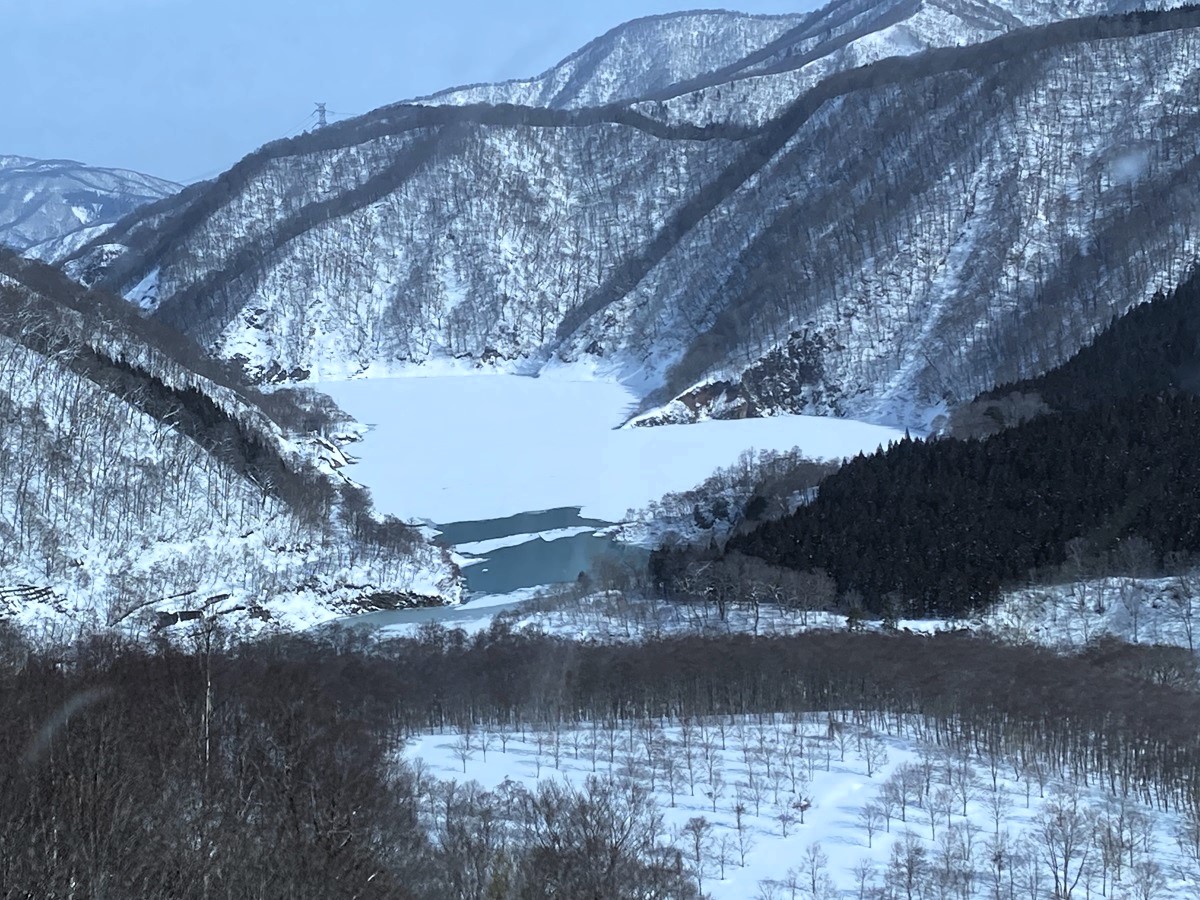 厳寒の冬山、苗場スキー場とかぐらスキー場を結ぶ「ドラゴンドラ」からの情景です。中央の湖は二居湖(ふたいこ)、凍てつく寒さが伝わってきます。