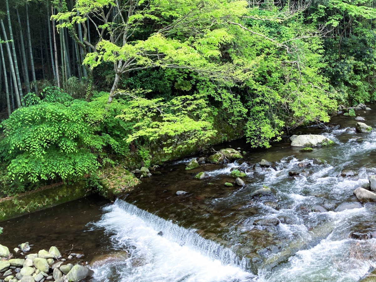 新緑に川のせせらぎが重なる湯河原温泉千歳川の情景をお届けします。流れる水音が聞こえるようで、春真っ盛りの爽やかさが伝わってきます。近隣には西村京太郎記念館が在ります。