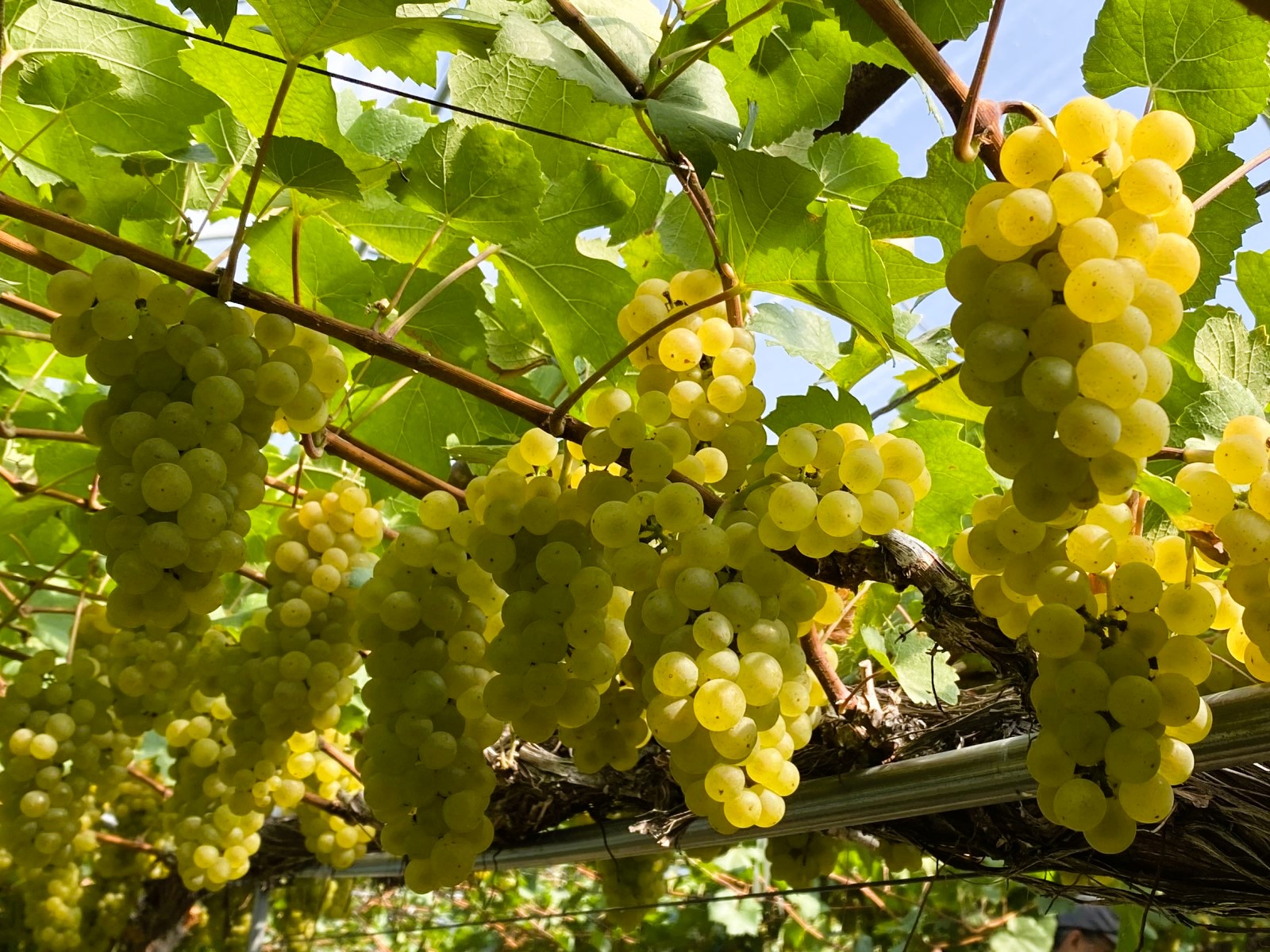 猛暑の夏が過ぎると実りの秋です。たわわに実ったブドウはワイン用品種のシャルドネ、きっと美味しい白ワインに化けるでしょう。