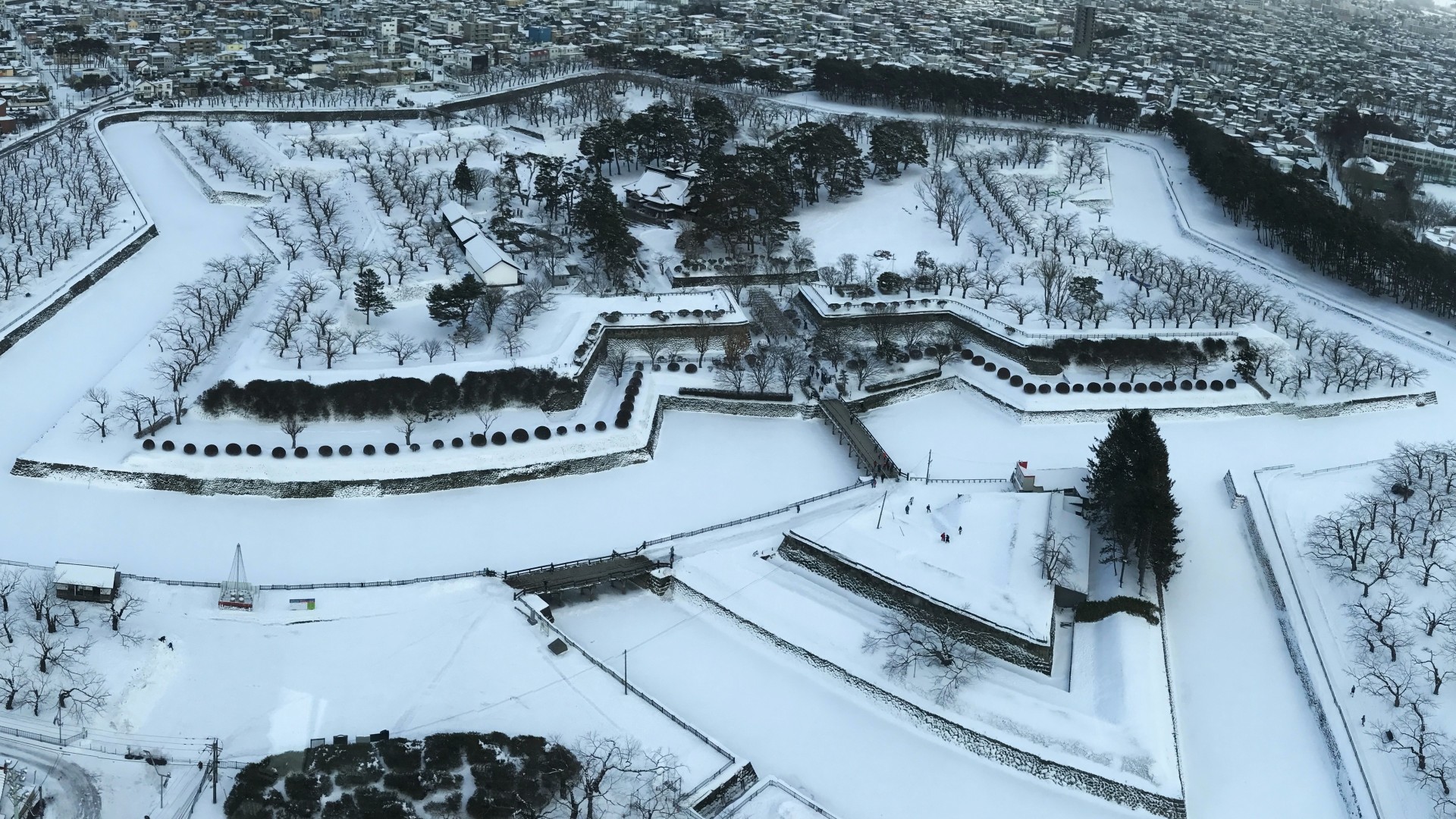 には、雪に覆われた五稜郭を選びました。北国の凛とした寒さが伝わってくる冬の情景です。