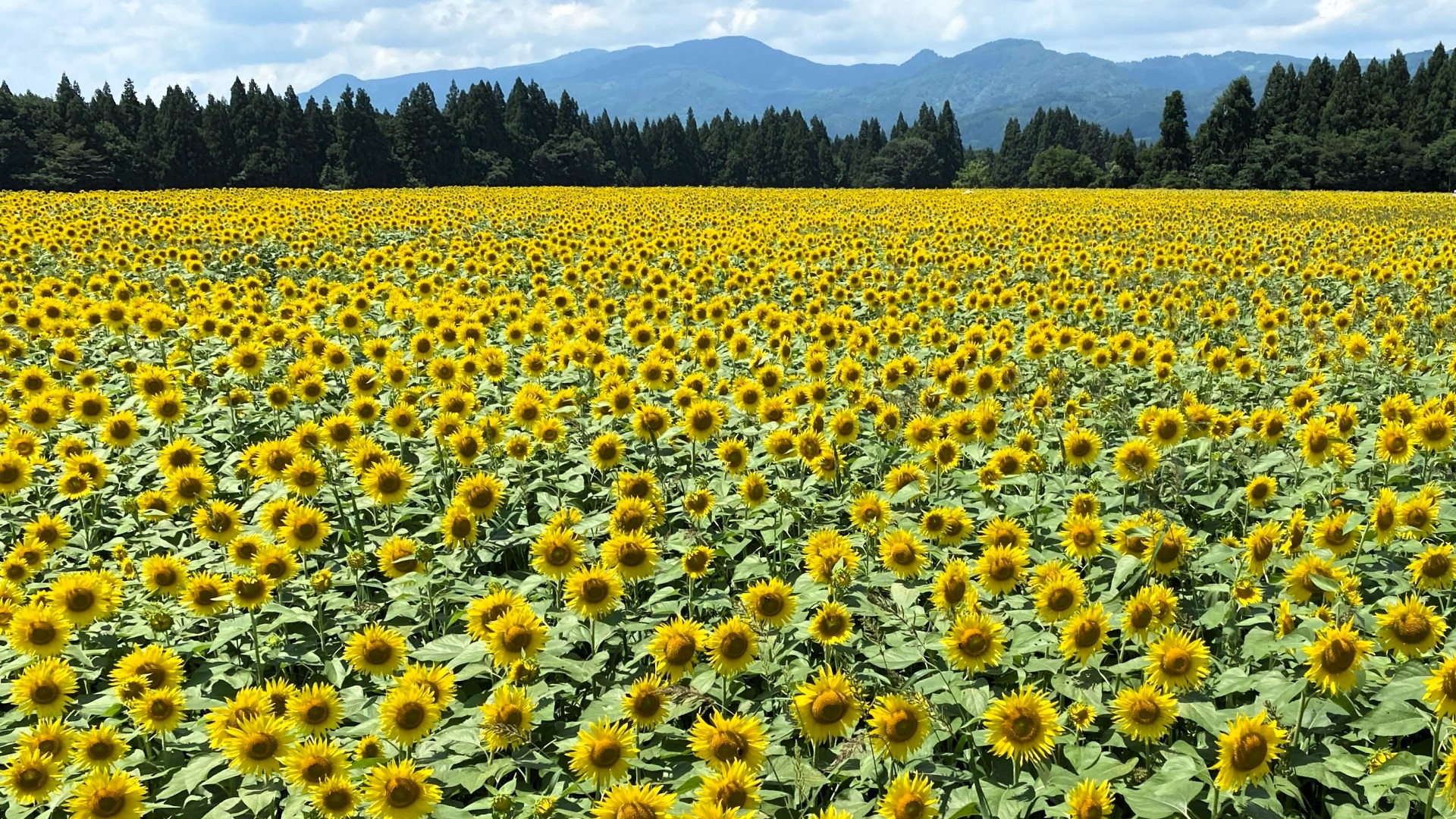 今月の画像は夏の花、ひまわりです。まるで黄色い海のように広がるひまわり、そして森の向こうには遠景の山と空、そのあざやかな対比が季節を感じさせてくれる情景です。